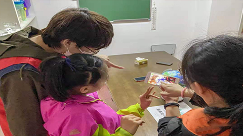 图为:志愿者带领孩子做手工
