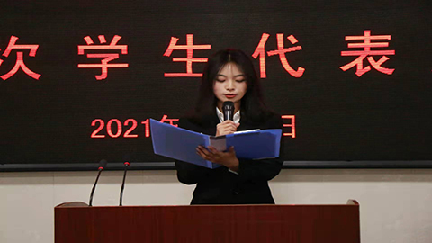 (图为:靳晓凯代表第二届学生委员会做工作汇报)