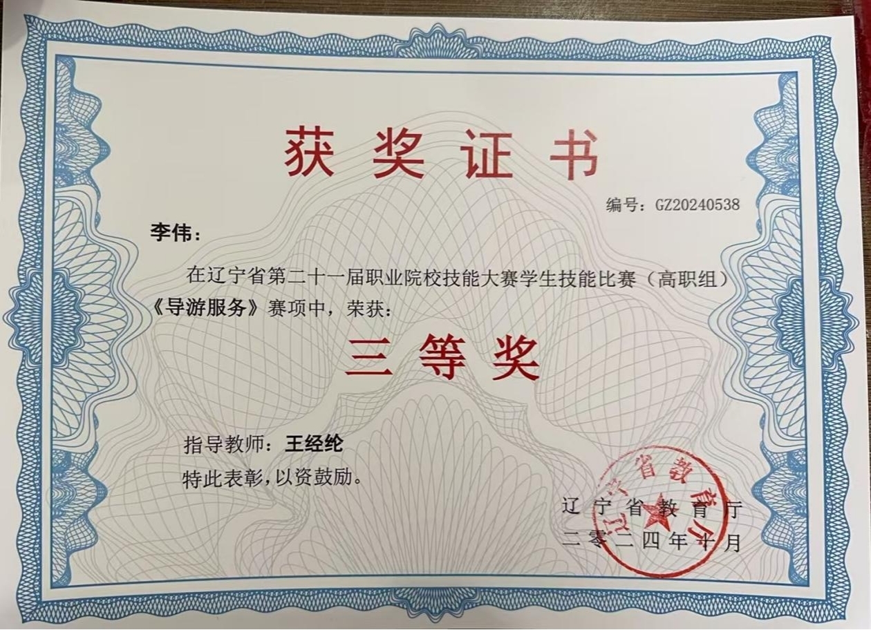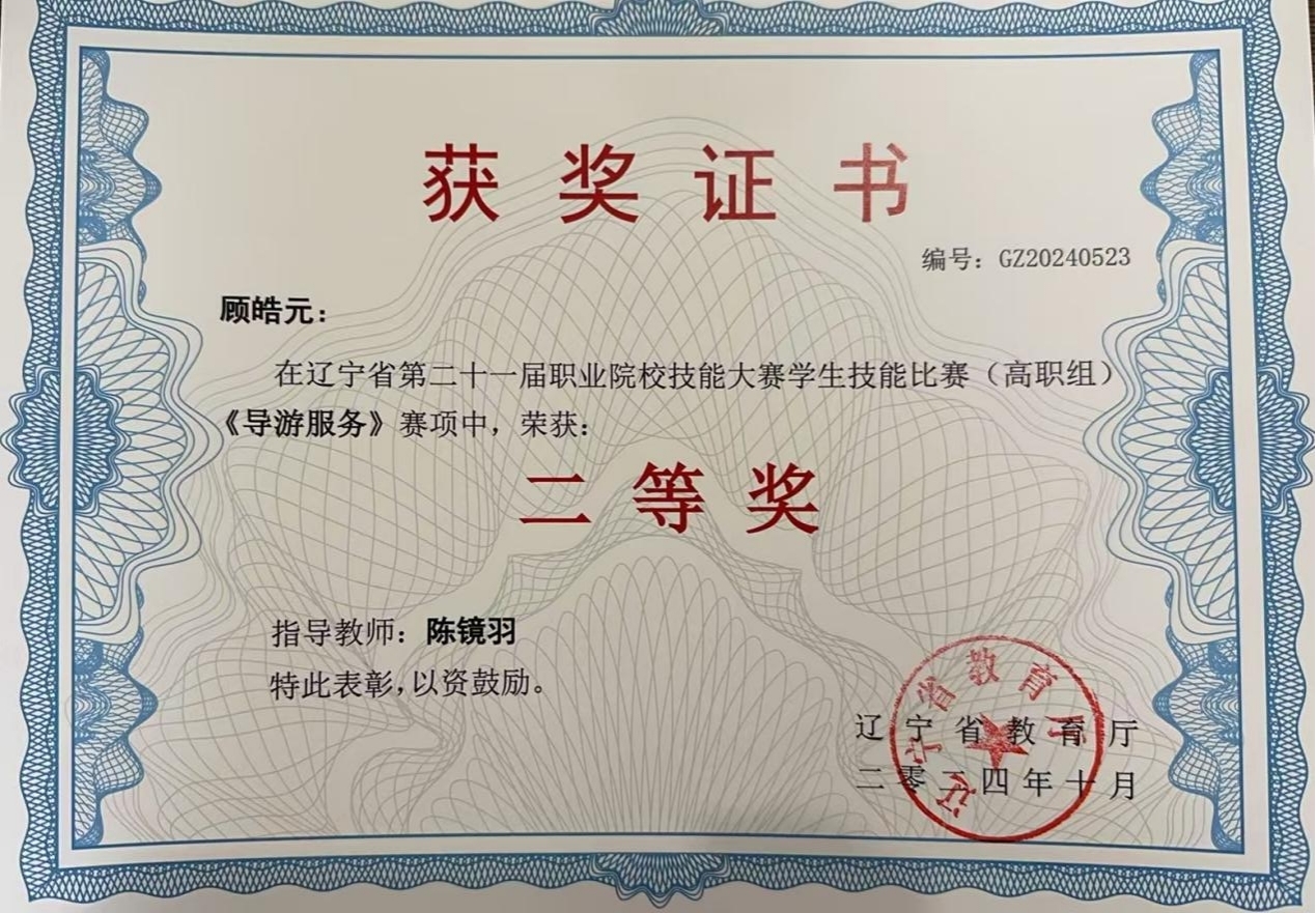 近日,我系收到了管理工程系旅游管理专业2022级学生顾皓元和李伟参与辽宁省第二十一届职业院校技能大赛二等奖和三等奖的荣誉获奖证书。