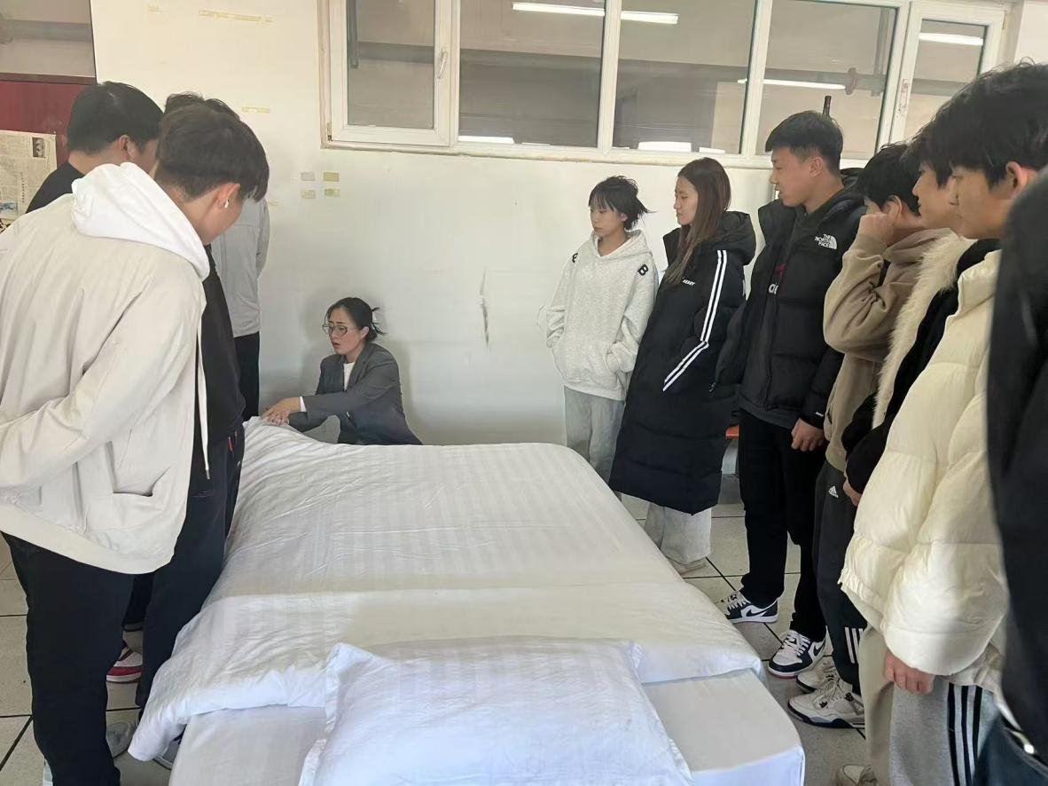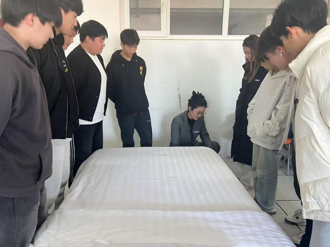 由陈镜羽、王雪、刘斯源三位教师负责本次实训教学。首先由指导老师详细的讲解着客房整理的每一个步骤和要点,包括整理床铺等基础环节,学生们认真对待,力求每一个细节都符合行业高标准。整个实训过程中,同学们相互交流经验,分享着各自的小技巧,遇到问题时积极向老师请教。在这一方小小的客房模拟空间里,他们正努力将理论知识转化为实际操作技能,为未来踏入服务行业奠定坚实的基础。