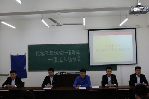 5月6日下午,电气工程系团总支在教学楼515召开“纪念五四运动一百周年”——重温入团仪式活动。
