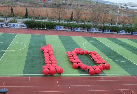 接下来便是万众瞩目的团体舞表演,由70名同学手持红伞组成的团体操队,以轻盈的脚步踏浪奔向绿茵场中央形成闪电造型。他们手中火红的伞,像一簇簇跳跃的火苗,宛如他们灿烂的青春。繁体的伞字上方的一个“人”字代表着我们的学院,下方的四个“人”代表着我们装院的四个系,同舟共济、努力拼搏,同时也寓意着我们的大装院人丁兴旺,愈见辉煌。