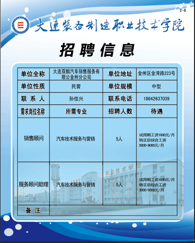 大连双麟汽车销售服务有限公司金州分公司招聘