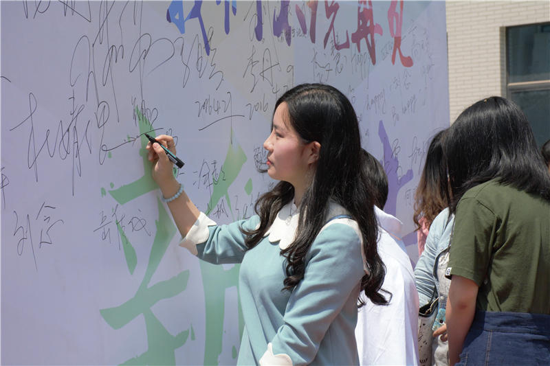 毕业生在留念板上签名。