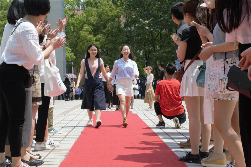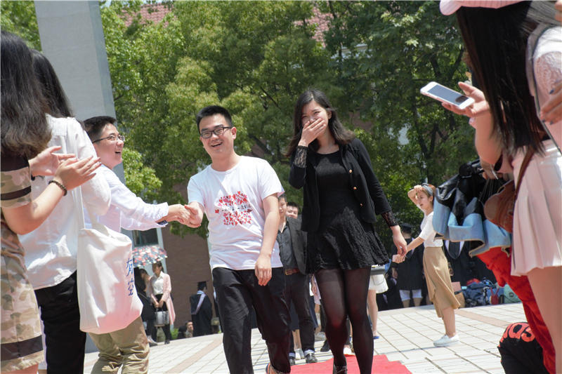 走红毯成为此次留念会的最大亮点。全体毕业生,根据新闻、广电、广告、播音主持的专业顺序,依次从红毯末端走上前来,已经走过红毯的学生自发站在两侧,为其他学生鼓掌欢呼,情绪十分高昂。图为毕业生在走红毯。
