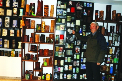 赵敬钊教授和他收藏的笔筒。记者郭佳 摄